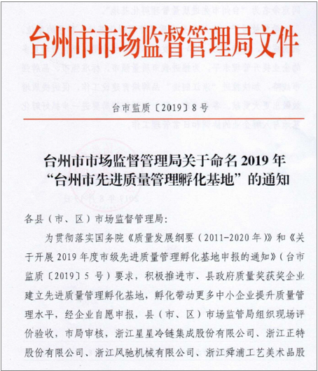 2019年8月19日,臺州市市場監督管理局發布了臺市監質[2019]8號文件關于命名2019年“臺州市先進質量管理孵化基地”的通知,我公司在2019年度臺州市級先進質量管理孵化基地申報項目申報工作中,經市場監管局組織現場評價驗收,市局審核,同意命名為“臺州市先進質量管理孵化基地”。
