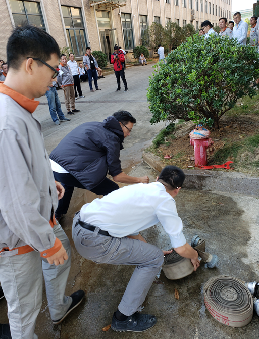 公司每年都會開展2次以上消防演練競賽活動,同時開展多次消防知識培訓,目的是讓員工提高員工安全消防意識,增強自我保護能力,學習和掌握消防安全知識及對突發(fā)火災的應變、逃生技能。今年公司于10月19日下午在廠區(qū)內(nèi)開展了消防演練競賽活動,活動包含單人手提4KG干粉50m滅火、5人2盤水帶連接競賽及火災場所逃生演練,各部門員工踴躍響應號召主動參加了此次演練。