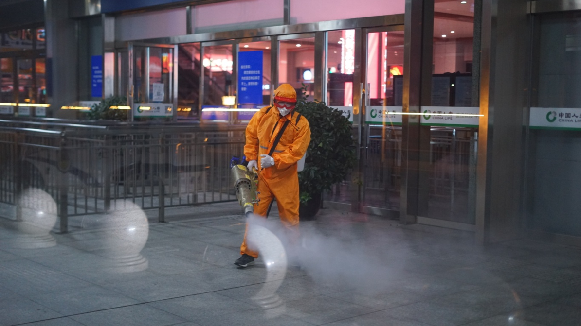 呂有谷和隊友們戴著背負式彌霧器一起上陣,在動車站大廳、售票處、衛(wèi)生間等區(qū)域進行了全方位、無死角消毒滅茵。在近兩個小時的消毒作業(yè)過程中,防