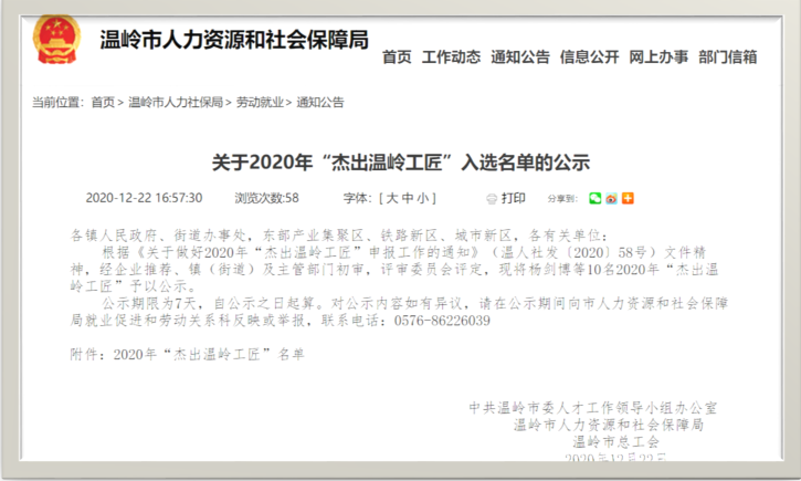 根據《關于做好2020年“杰出溫嶺工匠”申報工作的通知》(溫人社發〔2020〕58號)文件精神,我司研發中心工程平臺車工技師莫朝陽符合申報要求,通過公司推薦,主管部門初審,評審委員會評定,順利通過被評定為“杰出溫嶺工匠”