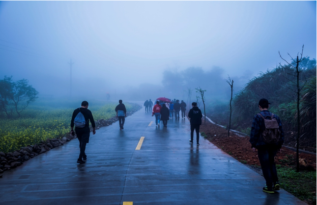在各組成員吃飽喝足充滿能量之后 ,開(kāi)始了此次活動(dòng)最高潮部分——暴走。在開(kāi)始暴走之前,參加暴走的全體成員在自行車協(xié)會(huì)牌前集合進(jìn)行了合影留念,之后開(kāi)始了暴走活動(dòng)。天氣依然是跟早上一樣,三米開(kāi)外的地方,似乎什么都看不清了,天空中也下著蒙蒙細(xì)雨,但一點(diǎn)也不影響我們的心情。大家一邊歡快地聊著天,一邊向上地攀登者。享受著霧蒙蒙的風(fēng)景,在這詩(shī)情畫意中繼續(xù)著。很快我們從平坦的水泥路轉(zhuǎn)到了泥濘的山路中。疊翠的峰巒、茂密的森林和曲折盤旋的山路讓我們不禁陶醉其中,盡情領(lǐng)略大自然的風(fēng)情。各個(gè)部門之間都彼此相互鼓勵(lì)、相互協(xié)助,不斷挑戰(zhàn)著自己。