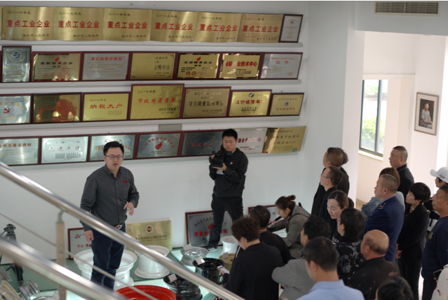 潘總裁在依序引領(lǐng)各體驗(yàn)者們參觀了產(chǎn)品展示區(qū)、計(jì)量室及公司辦公區(qū)域后,一起帶領(lǐng)生產(chǎn)總監(jiān)蔡云峰、總裁辦主任趙錦翔共同陪同各體驗(yàn)者參觀了我司的各生產(chǎn)區(qū)域,在參觀途中,由三位領(lǐng)導(dǎo)分批對各體驗(yàn)者們詳細(xì)講解了我司的生產(chǎn)工藝流程、產(chǎn)品制造特性、機(jī)器換人、模具制造及我司的特殊工藝等等,同時(shí)媒體記者也在緊隨著全程拍攝報(bào)道,行業(yè)專家、人大代表及各品牌消費(fèi)者參觀后紛紛表示對我企“品質(zhì)標(biāo)”品牌的一致認(rèn)同。